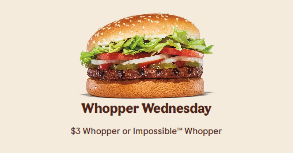 Don’t miss out on Whopper Wednesday at Burger King! For today only, you can enjoy a delicious Whopper or Impossible Whopper for just $3. This limited-time offer is available exclusively through the Burger King app. Indulge in your favorite burger at an unbeatable price, but hurry—this deal is valid today only.